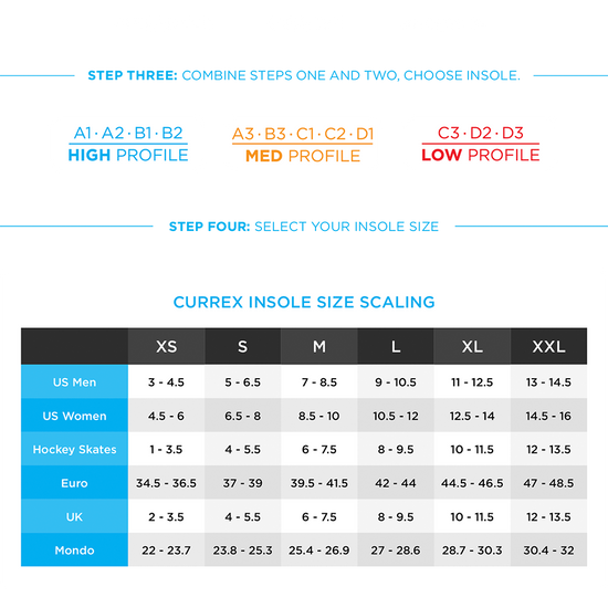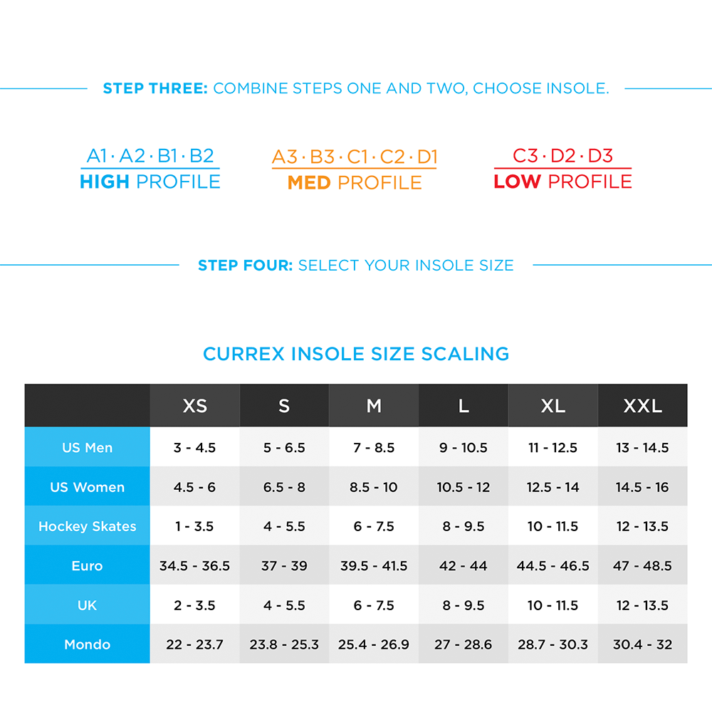 The Currex insoles come in multiple sizes to fit all feet types. Use the image slider sizing guide to help pick out the correct size and profile insole for you.
