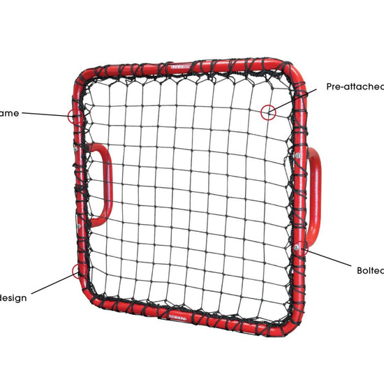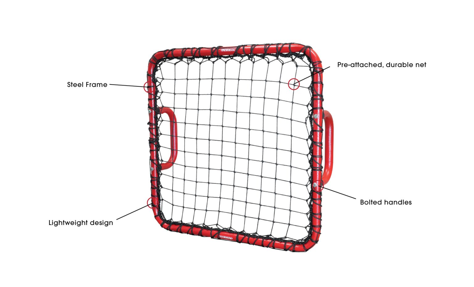 Lightweight steel frame with robust integrated netting for excellent rebound attributes. Bolted handles give the goalie coach or goalkeeper a solid hold of the rebounder.
