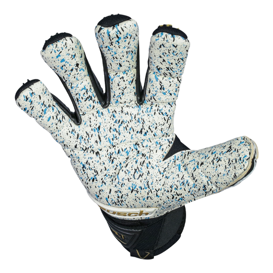 R-Grip Fusion Foam. This new latex offers the best grip in the reusch range. The fusion latex is sprinkled with hard ground and soft ground foam for greater grip and durability. The palm also features ergonomic palm embossing, which allows the latex to flex and move with the hand, eliminating any bunching. At the base of the palm, Reusch have engineered a Duraguard patch to help reduce excess wear in that vulnerable area of the palm. Additional attributes of the palm construction include a 3D Thumb Notch at the base of the thumb and index finger, to reduce tearing of the palm and base material.